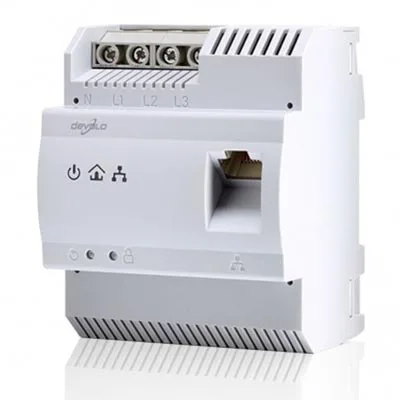 Se trata de un adaptador PLC de carril DIN de hasta 200 Mbps que puede, gracias a su diseño especial, engancharse directamente al carril DIN del cuadro eléctrico de distribución de la instalación eléctrica del edificio. Debido a que el adaptador HomePlug AV se instala en el corazón de la corriente eléctrica, funciona de un modo centralizado desde dicha ubicación y puede intercambiar datos correctamente en cualquier fase de la red eléctrica existente.