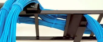 También puede instalarse entre bastidores para unirlos. Los pestillos en la parte delantera pueden abrirse giratoriamente, permitiendo que grandes cantidades de cable se alimenten y eviten que se caigan. Las tapas se encajan en el canal para ocultar los cables y proporcionar un aspecto limpio y limpio.