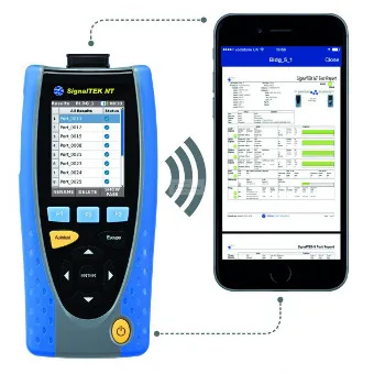 SignalTEK NT es un comprobador de transmisión de red con conectividad inalámbrica que se convierte en una solución completamente móvil. La nueva funcionalidad permite generar informes automáticamente en formato PDF o CSV que se pueden “personalizar” con detalles de la compañía o del operador.