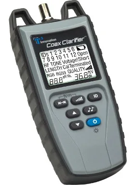 Comprobador para redes de cable coaxial El Coax Clarifier lleva a cabo diferentes funciones útiles para cualquier instalador en redes de cable, incluyendo medición de longitud de cable, test de cable coaxial, rastreo de tono e identificación de extremos a través de splitters.