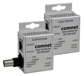 - CLEK11EOC: Estos mini extensores Ethernet-sobre-coaxial ofrecen datos Ethernet 10/100 Mbps sobre cable coaxial a una distancia de casi 400 metros en aplicaciones con restricciones de espacio. Un switch DIP permite configurar la velocidad entre 10 y 100 Mbps para adecuarse a las necesidades de cada proyecto.