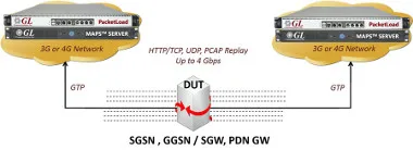 El tráfico de paquetes puede ser generado con los simuladores MAPS UMTS/LTE de GL junto con el módulo PacketLoad que permite la encapsulación del paquete de datos generado con cabeceras GTP y transmisión a través del puntos de gateway como los SGSN y GGSN, o SGW y PGW.