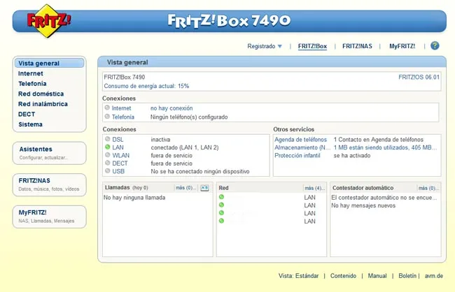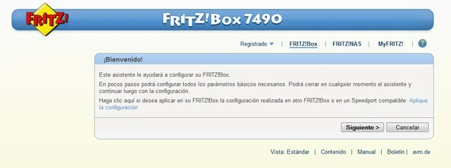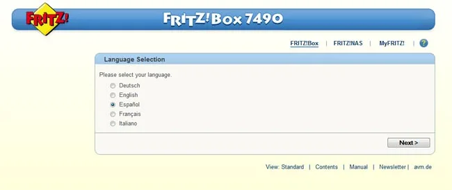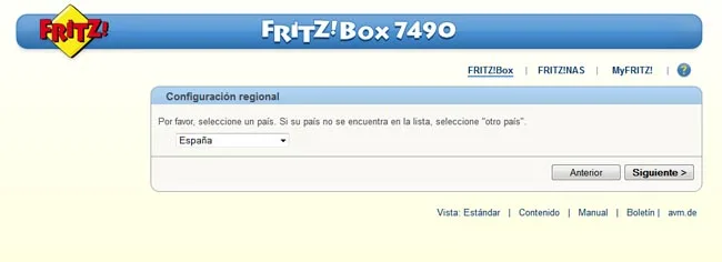 Una vez conectados los cables de alimentación y de red abrimos el navegador y accedemos al interior del Fritz!Box 7490. Y, en tan sólo tres simples pasos de configuración (idioma, país, y tipo de ADSL) podemos acceder al menú completo del router.