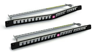 En principio, se presentan dos tipos de paneles de 24 puertos para 19″ en 0,66 unidades de altura, formato recto tradicional y formato angulado para facilitar la administración de los latiguillos de parcheo hacia los perfiles de cualquier rack y así liberar el frontal del mismo. Ambos paneles para alta densidad son modelos que incluyen administrador trasero para facilitar la instalación de los enlaces.