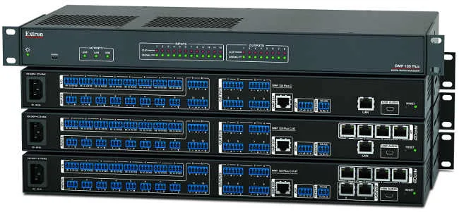 Configurable utilizando el software de configuración Extron DSP, la serie de procesadores DMP 128 Plus dispone de una matriz de mezcla extendida, de hasta 84×48. Pueden ser empleados donde sea desde un sistema basado en credenza hasta un gran sistema multi-rack e, incluso, en un sistema para un complejo descentralizado multiedificio de mayor tamaño.