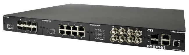 Switch gestionado layer-2El CTS24+2[POE][HO] de ComNet es un switch gestionado layer-2 que monta 26 puertos en total. De estos, 24 son puertos de tipo Ethernet 10/100, y los dos restantes son de tipo 10/100/1000TX o 1000FX.
