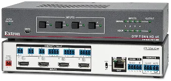 Diseñado para sistemas DTP, este switch HDMI 4K de Extron puede ser integrado con un switcher de matriz para presentaciones Extron DTP Crosspoint, así como con otros productos compatibles DTP, para ofrecer soporte a hasta cuatro fuentes HDMI en una localización remota.